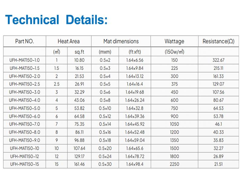 +10%/-5%UFH-MAT безопасен как для сухой, так и для влажной среды. и поскольку они закреплены на клею тканевая сетка, делающая монтаж нагревательного кабеля быстрым и простым.